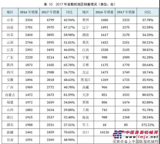2017 年国内市场装载机累计销售78051台,与2016年同期的53249台增长46.58%。在地区分布中,2017山东省仍以4799台的销量稳居榜首,紧随其后的河南3975台,河北3895台,云南3595台,江苏3493台,排在销量靠后的海南、上海、青海、天津、西藏也都在千台以上。