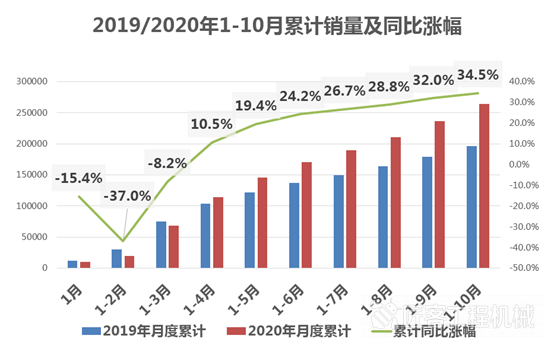 2020年1-10月,共销售挖掘机263839台,同比增长34.5%,累计销量增幅较1-9月份进一步扩大2.5个百分点(见下表)。
