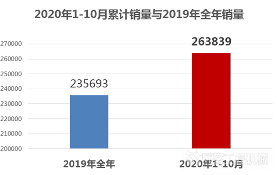 2020年前9月已经完成了2019年全年的挖掘机销量,至10月底,已超出去年销量达28146台,再度刷新历史纪录(见下表)。