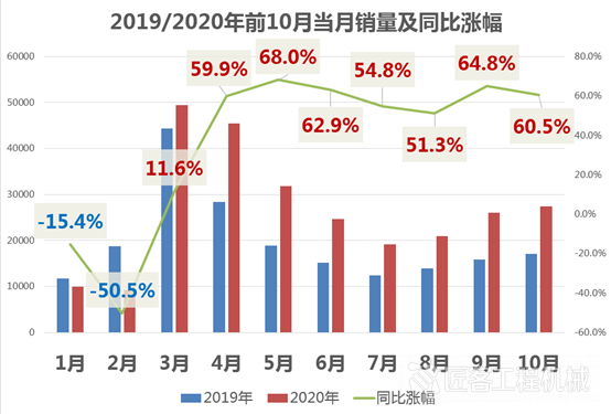 据中国工程机械工业协会统计,2020年10月纳入统计的25家挖掘机制造企业共销售各类挖掘机27331台,同比增长60.5%,继续维持60%以上的销量增幅(见下表)。