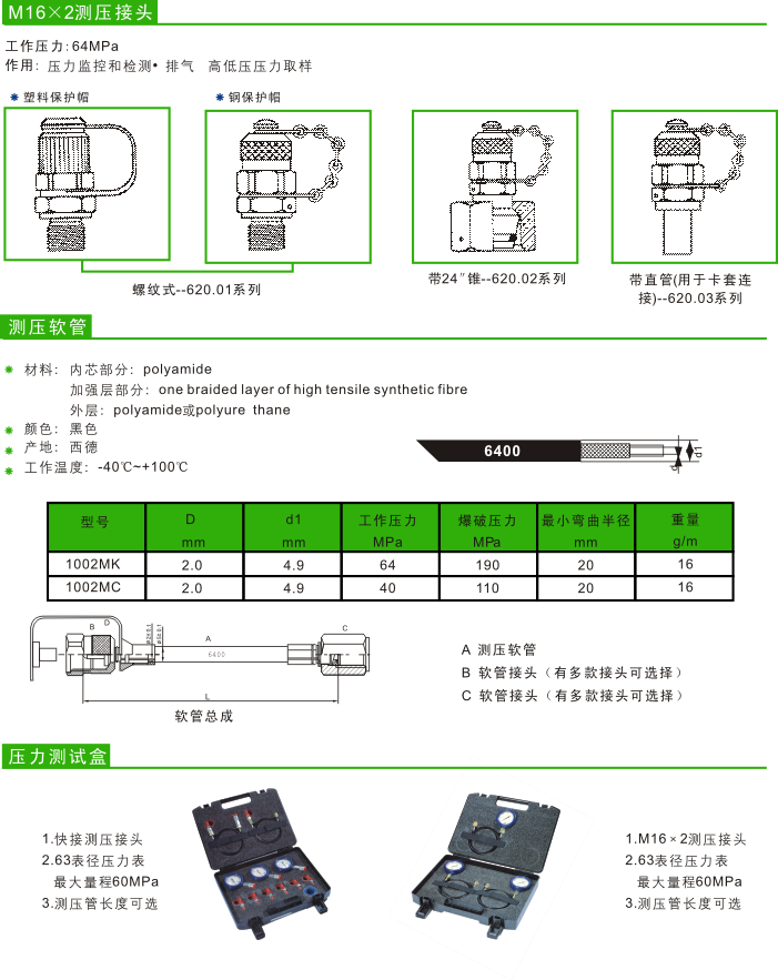 意大利著名液压元件制造商,可为您提供高品质的液压接头和液压胶管,能为您提供一种简单、低成本的检测液压系统压力的手段。不再需要永久性安装的压力表和压力表开关,因而减少了成本。MCS 测压接头可安装在液压系统中需要监测压力的任一位置。MCS提供可选软管接头形式,以适应来自其他供应商的测压接头。此外,还可用来在液压系统各点采取油样,或作为放气装置。